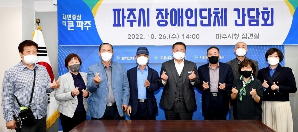 이날 간담회에는 김경일 파주시장을 비롯해 이순우 파주시 장애인단체연합회장과 연합회 소속 7개 장애인복지단체가 참석했으며 장애인의 복지증진과 권익보장을 위해 다양한 의견을 나눴다.