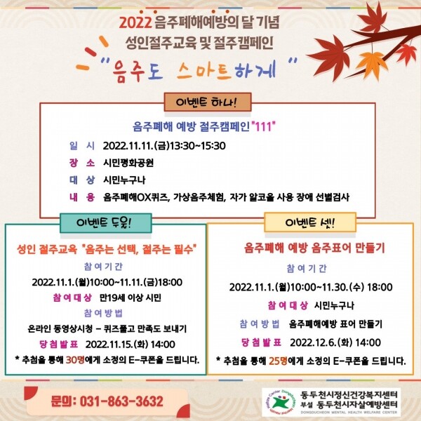 또한, 성인 절주 온라인 교육과 음주 표어 만들기에 참여한 시민에게는 추첨을 통해 소정의 e상품을 제공할 예정이다.