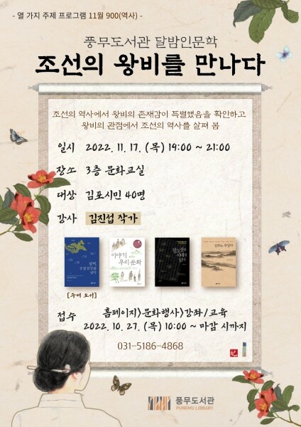 두 시간에 걸쳐 진행되는 이번 달밤인문학 강연은 ‘왕비, 궁궐 담장을 넘다’, ‘이야기 우리 문화’, ‘정도전의 시대를 읽다’, ‘신화는 두껍다’ 등을 집필한 김진섭 작가가 맡아 진행한다.