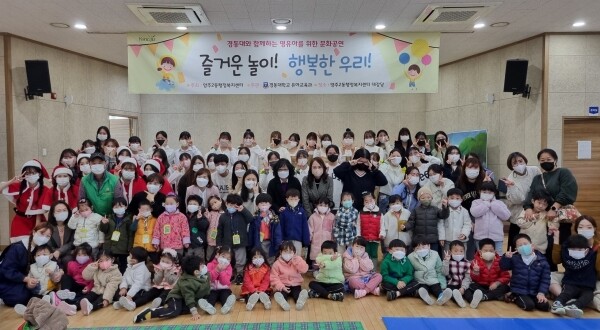 공연에는 관내 유아 40여명이 참석했으며 경동대학교 유아교육과 8개 동아리 중 ‘놀부’,‘사물놀이’,‘음률’, ‘동극’동아리가 참여해 퀴즈 맞히기, 동요 사물놀이, 율동, 동화연극 등 다양하고 흥미로운 공연을 선보였다.