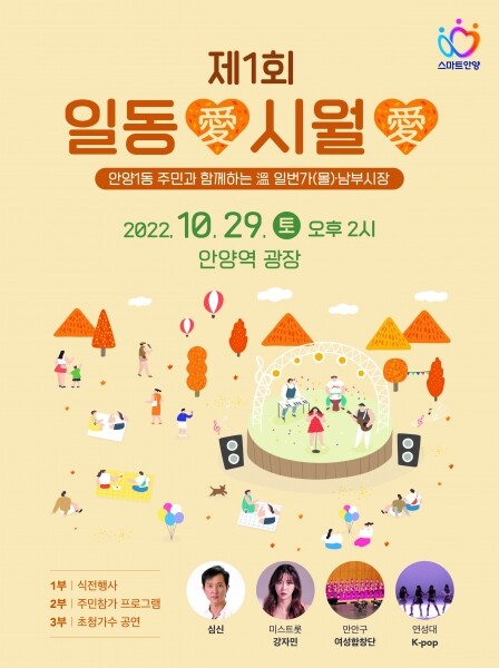 이번 ‘일동愛 시월愛’는 특별 초청공연으로 가수 심신, 강자민, 연성대 K-pop학과, 만안구 여성합창단, 그리고 주민자치 프로그램 발표 등 여러 장르의 무대를 통해 축제를 찾은 모든 이들이 함께 즐길 수 있도록 기획했다.