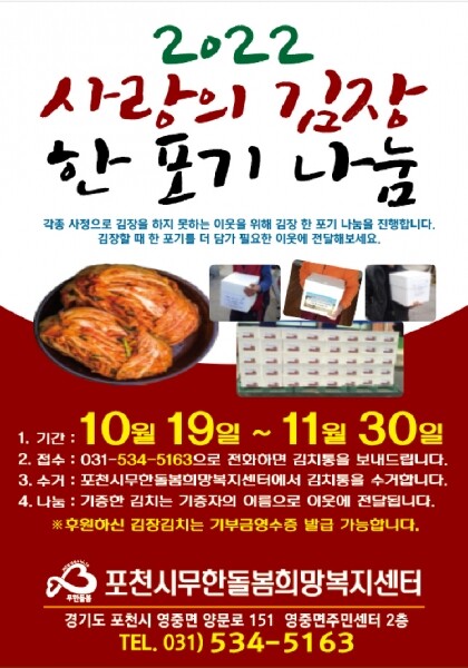 포천시무한돌봄희망복지센터 관계자는 “사랑의 김장 한포기 나눔 캠페인을 통해 겨울철 김치가 필요한 소외된 이웃들에게 많은 지역 주민들께서 도움을 주셨으면 좋겠다” 면서 “일상생활 속에서도 이웃사랑을 실천할 수 있는 나눔 문화가 이번 캠페인을 통해 확산되길 바란다”며 지역 주민과 단체의 적극적인 참여를 당부했다.
