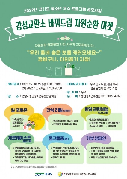 이번 마켓은 2022년 경기도 청소년 우수 프로그램 공모사업으로 선정된 ‘감성교환소 바꿔드림’ 활동의 일환으로 지구를 구하는 지속가능한 소비 진작을 목적으로 기획 추진되는 행사다.