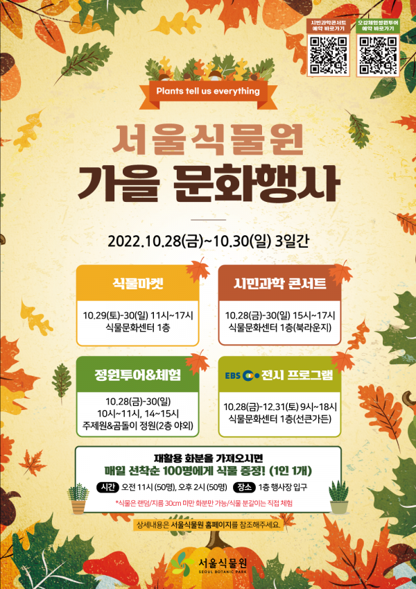 김대성 서울식물원장은 “깊어가는 가을, 누구나 다양하게 즐길 수 있는 전시와 체험, 강연, 벼룩시장을 준비했다”며 “서울식물원을 방문 해 가을의 식물원 풍경도 즐기고 식물과 함께하는 풍성한 문화행사도 참여해보길 바란다”고 말했다.