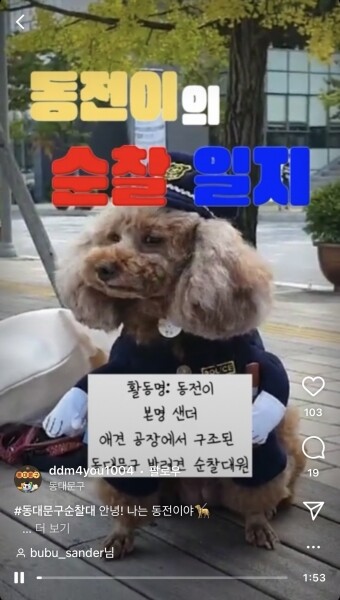 이번 홍보 영상의 주인공인 ‘동전이’는 동대문구 안전 지킴이의 줄임말로 유기견이었지만 현재는 동대문구 반려견 순찰 대원으로 활발히 활동하며 대학가의 안전을 책임지고 있다.