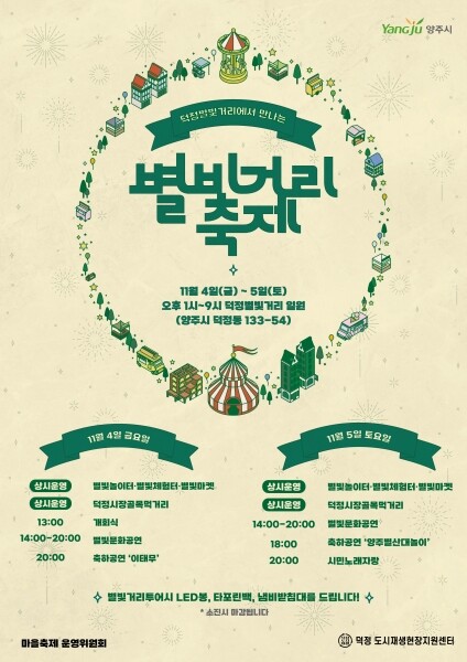 시 관계자는 “별빛거리 축제는 기존의 지역 축제와는 다르게 지역주민이 직접 축제 기획부터 운영까지 전 과정을 주도적으로 참여하는 좋은 사례가 될 것이라는 점에서 의미가 크다”며“덕정 주민이 열심히 준비한 마을축제에 양주 시민들의 많은 관심과 참여 바란다”고 말했다.