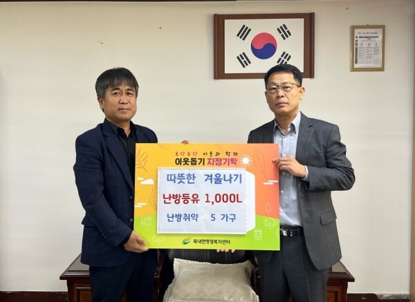북내면 따뜻한 겨울나기 난방유 지원은 추운 겨울이 다가오면서 난방에 어려움을 겪는 홀몸 어르신, 장애인 가구 등 저소득 난방 취약계층 5가구를 발굴해 각각 난방 등유 200ℓ를 쿠폰으로 지원하는 사업이며 북내면 지역사회보장협의체에서 지원 가구를 직접 추천하며 위기가구 발굴에 적극적으로 앞장섰다.