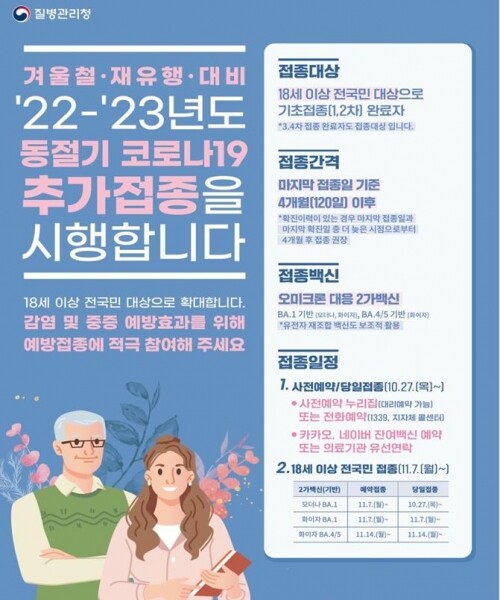 사전예약은 10월 27일부터 누리집 또는 전화 예약을 하고 잔여백신을 통한 당일접종은 SNS 당일예약 및 가까운 접종 위탁의료기관에 유선 예약이 가능하다.