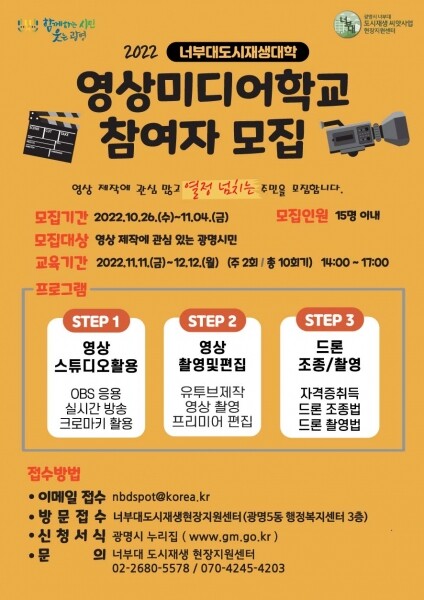 ‘2022 너부대 도시재생 영상미디어학교’는 매주 월요일과 금요일 오후 2시부터 5시까지 너부대 도시재생 현장지원센터 미디어실과 인근지역에서 총 10회에 걸쳐 진행된다.