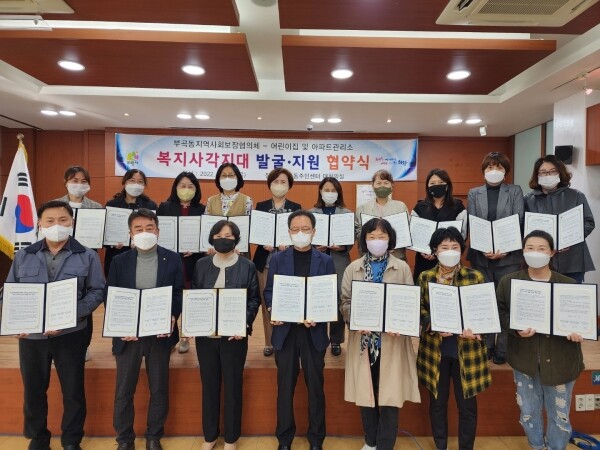 이번 협약을 통해 어린이집과 아파트관리소에서는 위기가정 발견 시 ‘부곡동협의체’로 수시 제보하기로 했고 ‘부곡동협의체’에서는 주민센터와의 공조를 통해 제보된 가정에 대해 신속하게 복지상담을 실시하고 필요한 복지자원을 연계하기로 했다.