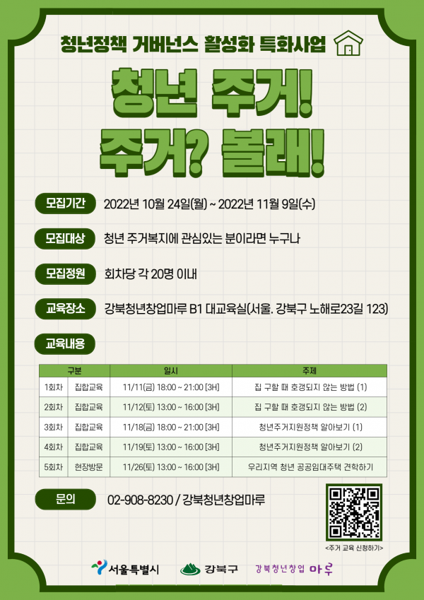 강북구와 강북청년창업마루가 함께 주관하는 이번 교육프로그램은 청년정책 거버넌스 활성화 사업의 일환으로 마련됐다.