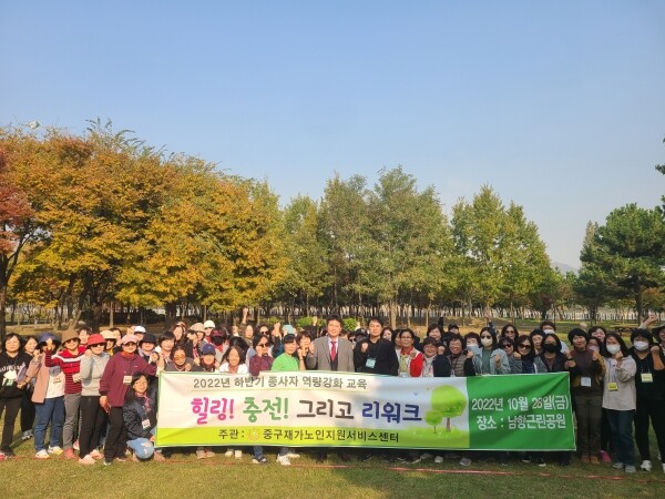 ‘힐링 충전 그리고 리워크’라는 주제로 중구 남항근린공원에서 약 70명의 종사자들이 힐링 프로그램, 분임토의 등 다양한 프로그램을 진행했다.