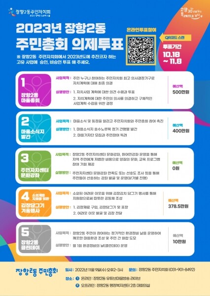 투표 대상은 장항2동 주민등록 거주자, 장항2동 소재 사업장·학교·기관·단체에 속해 있는 만 18세 이상 주민이며 마을 곳곳에 배포된 홍보전단지 QR코드 스캔을 통해 10월 18일부터 주민총회 전날인 11월 8일까지 20일간 온라인으로 투표 참여가 가능하다.
