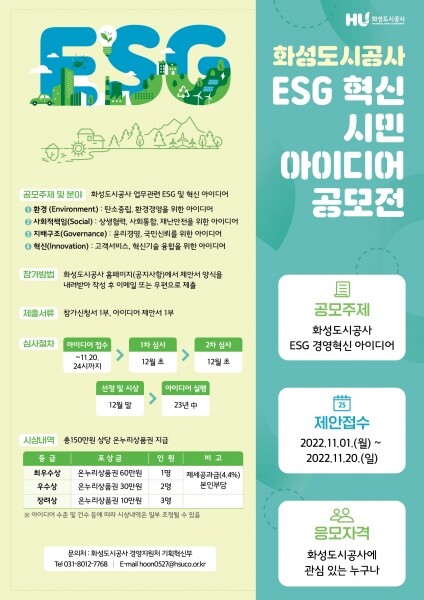 ‘ESG 혁신 아이디어 공모전’은 HU공사에 관심 있는 국민이라면 누구나 참여 가능하며 참여방법은 HU공사 홈페이지 공지사항에서 신청서 양식을 내려받아 작성한 후 담당자 이메일 또는 우편으로 제출하면 된다.