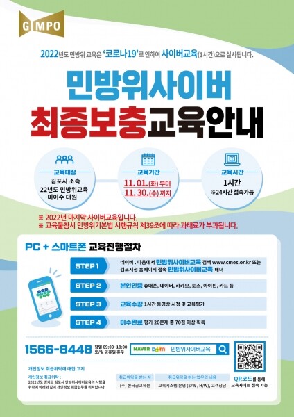사이버교육은 교육 기간 동안 김포시 민방위대원이라면 누구나 PC, 스마트폰으로 김포시청 홈페이지 배너 또는 민방위 사이버교육 홈페이지를 통해 접속해 1시간 교육 수강 후 최종 평가 70점 이상 점수를 취득하면 이수가 완료된다.