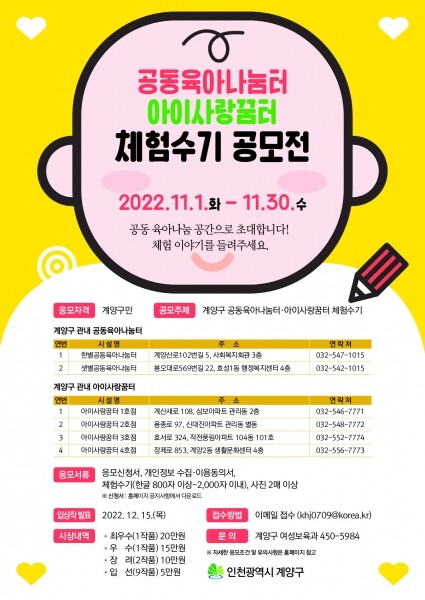 구 관계자는 “이번 공모전을 통해 계양구 공동육아나눔터·아이사랑꿈터가 활성화 되어 부모와 아이가 함께 행복한 공간으로 자리매김하는 계기가 되길 바라며 생생한 체험담을 기다린다”고 말했다.