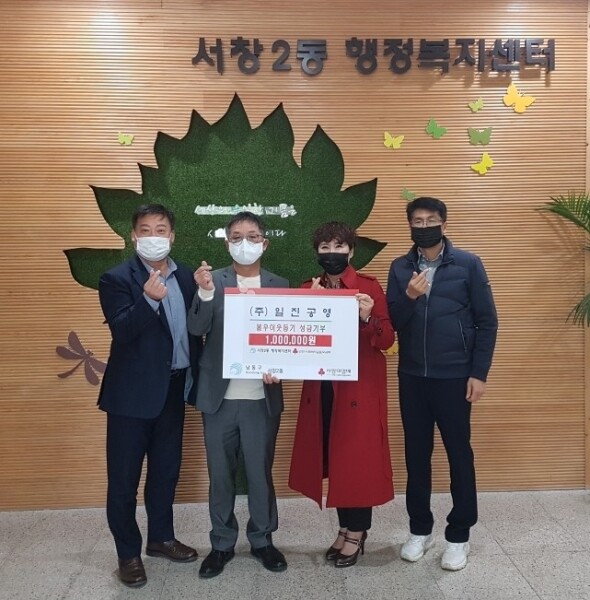 조한석 동장은 “점점 추워지는 날씨 속에서 어려운 이웃을 생각하며 기부라는 큰 사랑을 실천해주신 ㈜일진공영 관계자분들께 깊이 감사드리며 전달받은 후원금은 어려움을 겪고 있는 취약계층에게 도움이 되도록 의미 있게 사용하겠다”고 말했다.