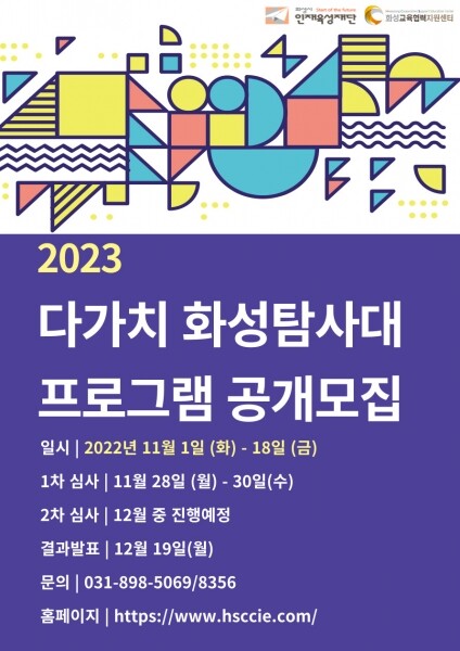 ‘2023 다가치 화성탐사대’는 화성시의 자연환경 및 인·물적 자원을 활용해 관내 초등학교 3, 4학년을 대상으로 환경·역사·문화예술 등 5개 분야의 다양한 창의적 체험학습활동을 지원하는 사업이다.