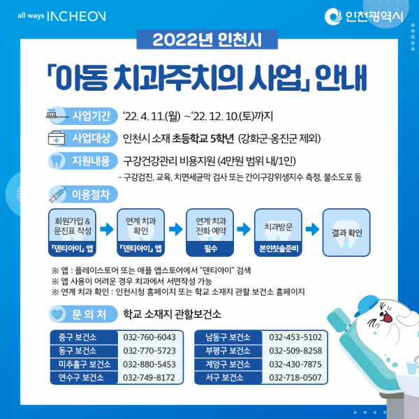 김석철 시 건강보건국장은 “관내 초등학교 5학년생이면 누구나 ‘아동 치과주치의 제도’를 꼭 이용해 비용 부담 없는 전문적인 구강관리서비스를 받길 바란다”며 “지속적인 구강건강관리서비스를 제공해 어린이들이 평생 건강한 치아를 유지할 수 있도록 노력하겠다”고 말했다.