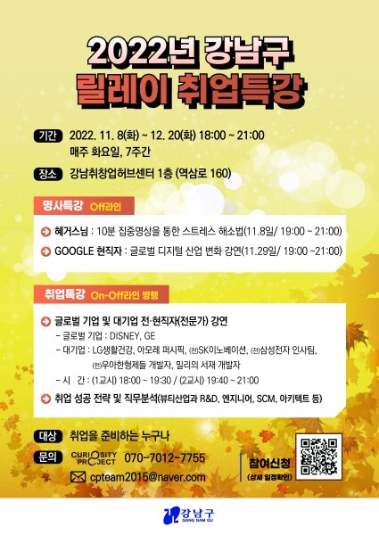 현장 대면 강의는 강남취창업허브센터 1층에서 진행하며 강남구청 유튜브로 생중계한다.