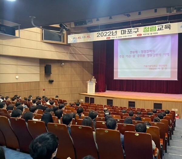 구는 지난 10월 25일 마포구청 2층 대강당에서 신규 임용자와 인허가 분야 담당 직원 등 400명을 대상으로 ‘청탁금지 및 공무원 행동강령 등 부패방지’ 교육을 진행했다.