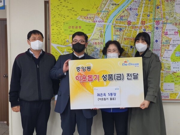 중앙동장은 “매번 잊지 않고 중앙동 이웃들을 위해 기부해 주시는 최은옥 5통장에 감사드린다 소중한 마음이 우리 이웃들에게 잘 전달될 수 있도록 중앙동도 최선을 다하겠다”고 밝혔다.