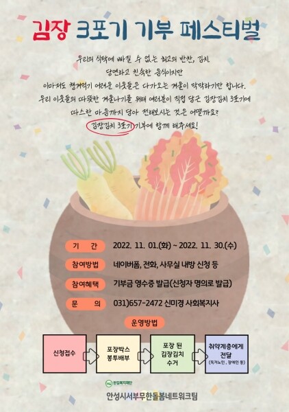 유성아 안성시서부무한돌봄네트워크팀장은 “후원자분들이 매년 관심을 가지고 함께 실천해주셨기에 김장 3포기 기부 페스티벌 행사를 10년째 이어올 수 있었다.