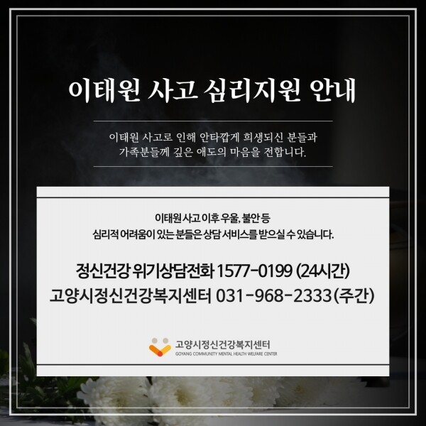 사고 목격자, 간접적인 영향으로 심리적 어려움이 있는 시민은 정신건강 위기상담전화 또는 고양시정신건강복지센터로 연락하면 상담 서비스를 이용할 수 있다.