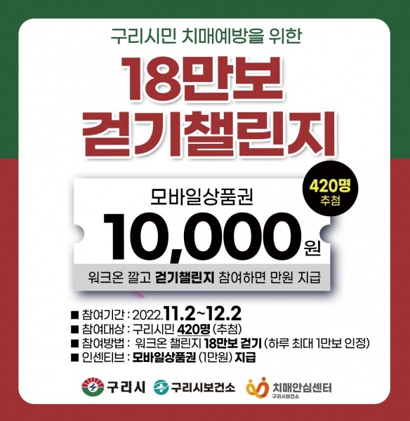 참여 희망자는 스마트폰에 워크온 어플을 다운로드 후 “구리시 공식 커뮤니티” 또는 “구리시 치매안심센터 커뮤니티” 가입 후 ‘함께걷는 치매예방 18만보 걷기챌린지’참여하기를 누르면 된다.