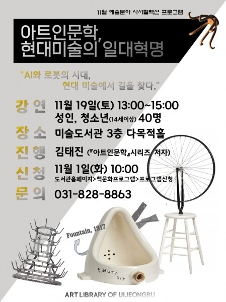 예술 분야는 11월 19일 오후 오후 1시 ‘아트인문학, 현대 미술의 일대 혁명’을 주제로 마르셀 뒤샹이 예술계에서 일으킨 혁명이 주는 메시지를 이해하고 AI와 로봇이 일상에 도입된 시대에 직업 영역에서 우리가 해야 할 노력에 대해 고찰해보는 시간을 갖는다.