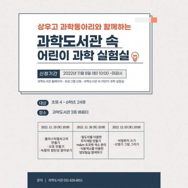 과학도서관 속 어린이 과학 실험실은 상우고 과학동아리와 함께하는 지역사회 협력 프로그램이며 초등 4~6학년을 대상으로 11월 19일부터 12월 3일까지 3회 운영된다.