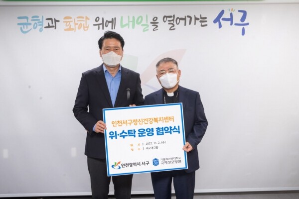 구는 2일 강범석 서구청장과 김현수 가톨릭관동대학교 국제성모병원장을 비롯한 관계자들이 참석한 가운데 서구정신건강복지센터 위탁 운영을 위한 협약을 체결했다.