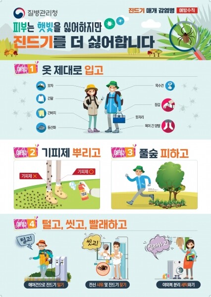 송탄보건소 감염병 대응팀 관계자는 진드기 매개 감염병에 감염되지 않기 위해서는 진드기 물림 주의 및 농작업 또는 야외 활동 시 예방수칙을 준수할 것을 당부했다.