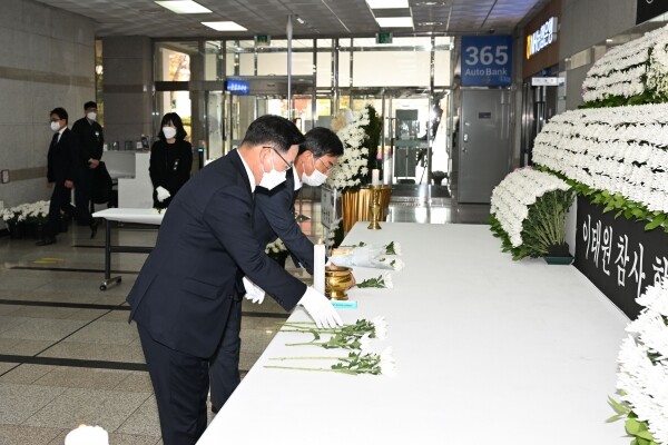 [뉴스써치] 강수현 양주시장을 비롯한 간부 공무원들이 3일 경기도 북부청사에 마련된 이태원 사고 사망자 합동분향소에서 찾아 헌화와 묵념을 하며 조문하고 있다.