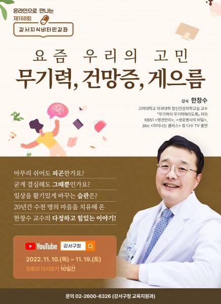 이번 강좌는 사전 신청 없이 오는 10일부터 19일까지 누구나 강서구청 공식 유튜브 채널인 i강서tv에 접속해 시청할 수 있다.
