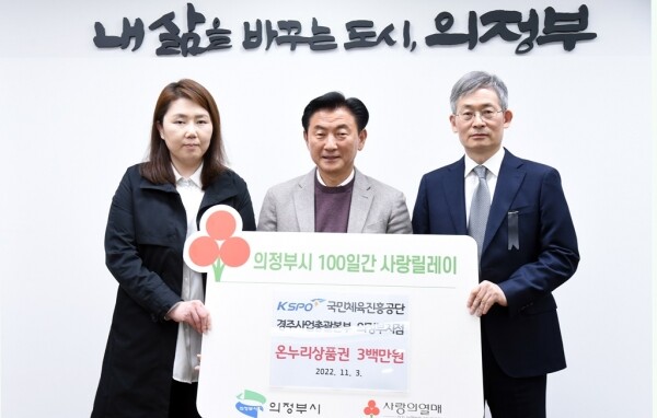김동근 의정부시장은 “국민체육진흥공단 경주사업총괄본부 의정부지점이 매년 100일 릴레이에 관심을 갖고 참여해주셔서 감사드린다”며 “기부해주신 온누리 상품권은 도움이 꼭 필요한 대상자에게 잘 전달하겠다”고 답했다.