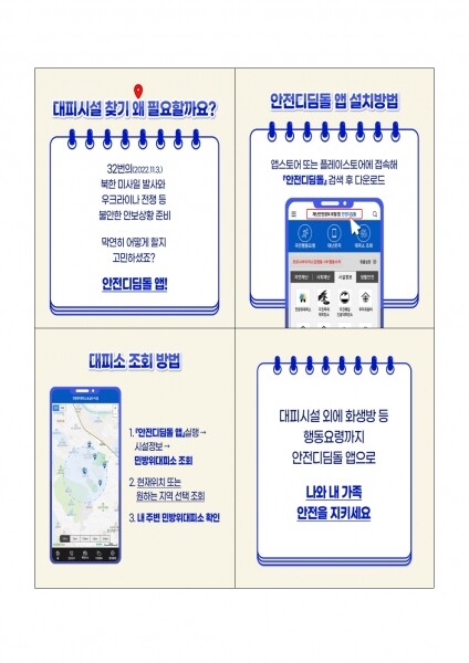 특히 최근 북한의 탄도미사일 발사로 인한 공습경보 발령 등에 대비해 유사시 가까운 대피장소로 신속히 대응할 수 있도록 평소에 앱을 활용해 사전에 대피장소 위치 및 대피요령 확인 등 다양한 재난 안전 정보를 숙지하는 것이 중요하다.