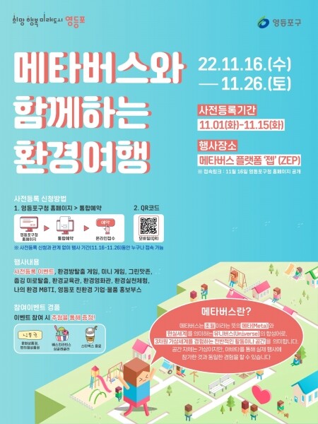 ‘메타버스와 함께하는 환경여행’은 구민은 물론 학교, 어린이집, 기업 등 관내 기관 및 단체도 참여할 수 있으며 오는 11월 15일까지 영등포구청 홈페이지의 통합예약에서 사전 등록 가능하다.