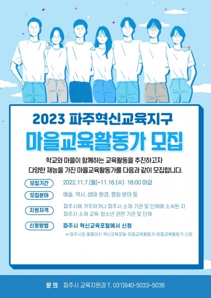 이성근 교육지원과장은 “파주혁신교육지구의 마을 특색 교육을 통해 학생들의 폭넓은 배움을 제공하고자 마을교육활동가를 모집한다”며 “질 높은 교육콘텐츠를 보유한 개인 또는 단체의 많은 지원을 바란다“고 말했다.