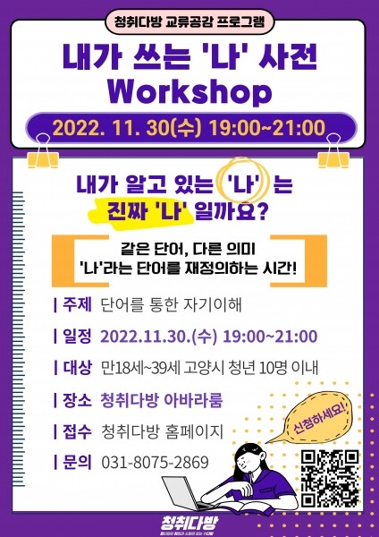 청취다방 관계자는 “마음건강 사각지대에 놓여 있는 청년들을 위해 1:1 심리 상담 틀에서 벗어나 워크숍 형태로 구성했다.
