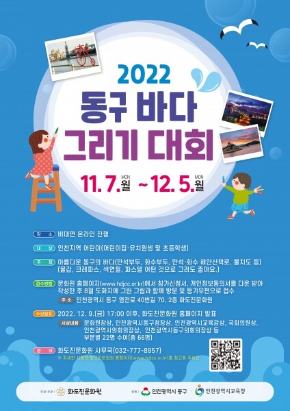 참가 희망자는 8절지 도화지에 물감, 크레파스, 색연필, 파스텔 등 사용 가능한 모든 재료로 만석부두, 화수부두, 만석·화수 해안산책로 물치도 등 아름다운 동구의 바다 모습을 자유롭게 표현하면 된다.