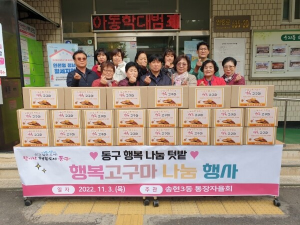 행복고구마는 송현3동 관내 공유재산 토지 중 활용도가 떨어지는 자투리 공간에 조성된 동구 행복나눔 텃밭에서 통장자율회 회원들이 직접 재배하고 수확했다.