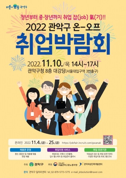 오프라인 박람회는 11월 10일 오후 2시부터 5시까지 구청 대강당에서 개최되며 현장에는 채용관이 마련되어 구직자들은 이력서와 자기소개서를 작성해 박람회에 참여한 기업에 지원할 수 있고 현장 면접도 진행된다.