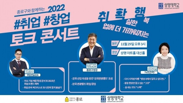 ‘청년 취업·창업으로 지역상생을’ 이라는 부제 하에 마련된 토크콘서트는 오후 3시부터 상명대학교 학생 약 100명이 참석한 가운데 치러진다.