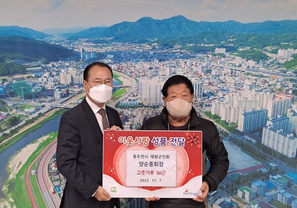 동두천시 재향군인회 양순종 회장직무대행은 수십 년째 관내 홀몸 어르신들에게 쌀과 연탄을, 저소득 가정의 학생들에게 장학금을, 여름철 경로당에 삼계탕을 후원해 오고 있으며 매년 사랑의 김장 나누기 행사 때마다 양념 및 고춧가루를 지원하는 등 따뜻한 이웃사랑을 실천해 지역사회 나눔 문화 확산에 앞장서고 있다.