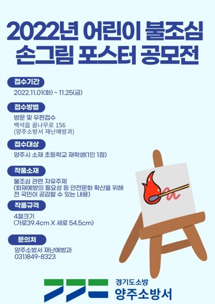 정상권 양주소방서장은 “아이들이 포스터를 그리는 과정을 통해 안전의식이 자연스럽게 배양될 수 있는 기회”며 “양주시 소재 초등학교 재학생들의 많은 참여를 바란다”고 전했다.