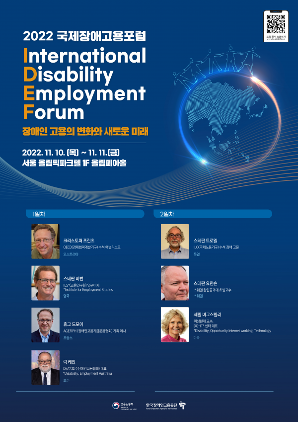 2022 국제포럼은 ‘포스트 코로나, 디지털 전환’으로 대표되는 뉴노멀 시대의 장애인 고용 확대 방안을 모색하고 해외 장애인 고용 전문가와 네트워크 및 인프라를 구축하기 위해 마련됐으며 경제협력개발기구, 국제노동기구 등 국제기구와 선진국의 장애인 고용 전문가들 7명이 연사로 참여할 예정이다.