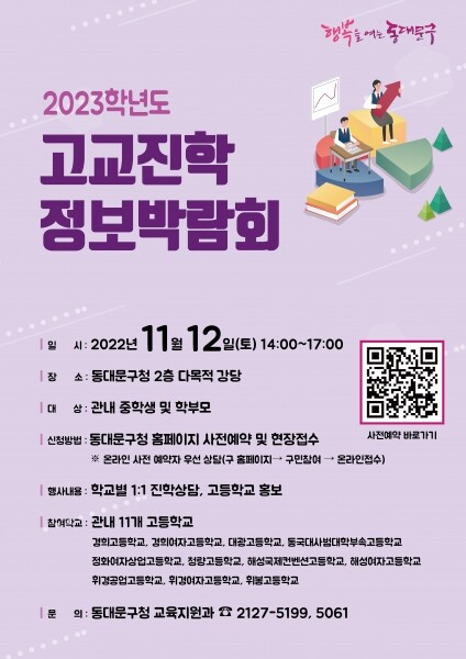 코로나19로 인해 3년 만에 대면으로 개최되는 ‘2023학년도 고교 진학 정보 박람회’는 관내 고등학교 진학을 희망하는 학생과 학부모를 대상으로 학교별 교육 내용과 진학에 대한 정확한 정보를 제공하기 위해 기획됐다.