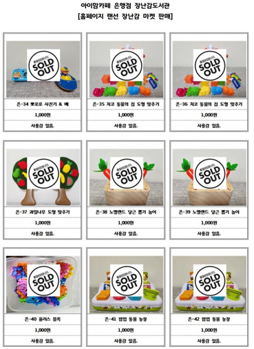 ‘홈페이지 랜선 장난감마켓’에서는 구성품 분실 및 결함이 있어 대여할 수 없는 장난감 총 90여 점을 아이맘카페 홈페이지에서 1,000원~3,000원의 저렴한 가격으로 판매했다.