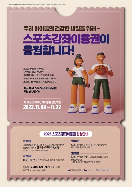 유·청소년 스포츠강좌이용권은 오는 22일까지 모집하며 모집 대상은 ‘국민기초생활보장법’에 따른 생계·의료·주거·교육급여 수급가구 또는 차상위계층에 해당되는 만 5~18세 유·청소년이다.